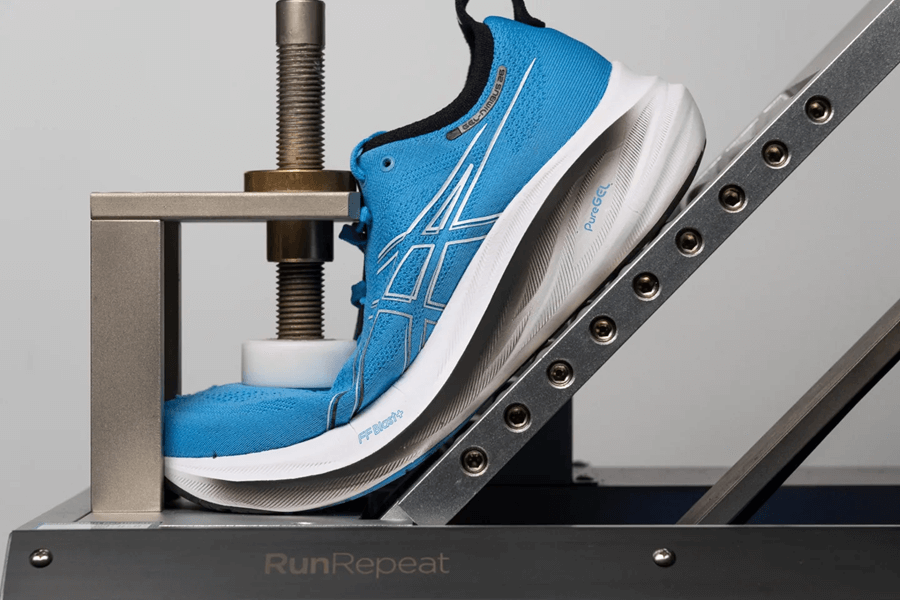 Bảng thống kê kết quả kiểm tra ASICS Gel Nimbus 26 tại phòng thí nghiệm so với trung bình nhiều mẫu giày chạy khác