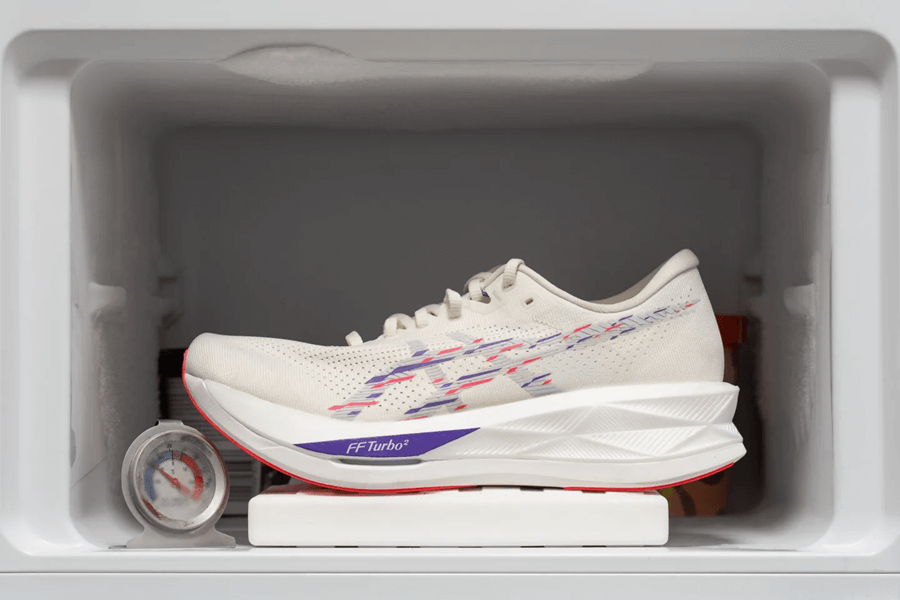 Nhờ foam A-TPU, ASICS Sonicblast giữ được hiệu suất tốt trong điều kiện lạnh. Sau 20 phút trong tủ đông, độ mềm chỉ thay đổi chỉ 4%, yên tâm là bạn có thể sử dụng giày ngay cả khi tiết trời lạnh hay trong suốt mùa đông.