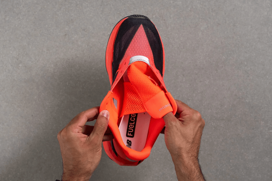 New Balance FuelCell Rebel v5 không có tab kéo gót nhưng đều có một miếng đệm tạo thành đường gờ nhô lên ở ở gót, bạn có thể tựa tay vào đó giúp dễ dàng xỏ giày hơn.