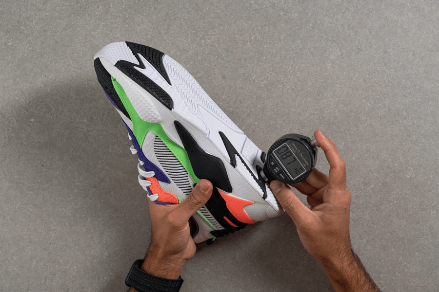 Sử dụng durometer để đo độ cứng của cao su, kết quả ghi nhận được độ cứng là 86.8 HC, cao hơn mức trung bình, cho thấy PUMA RS-X có độ cứng đế ngoài vượt trội.