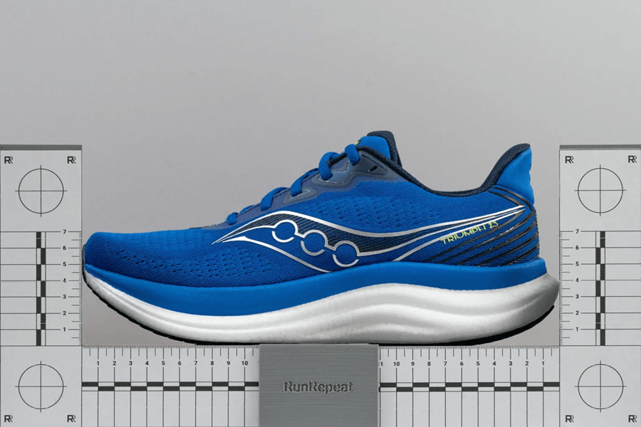 Thông số hãng công bố chiều cao gót là 37.0 mm nhưng kết quả đo thực tế của mình lại hoàn toàn khác. Thước đo dừng ở con số 42.3 mm, đưa Saucony Triumph 23 xếp vào nhóm đệm dày tối đa, loại bỏ hoàn toàn cảm giác chạm đất – hoàn hảo cho những runner yêu thích sự êm ái tuyệt đối.